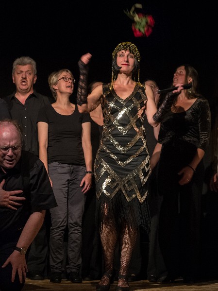 Ab in den Badezuber, hieß es dann beim nächsten Stück "Barbara Song " von Kurt Weill aus der Dreigroschenoper. Aus dem Badewasser schlürfen wollten dann die Herren des Ensembles in "Badewasser" von John Schonberger. Kriegerisch ging es zu "In der Seeräuber Jenny" von Kurt Weill aus der Dreigroschenoper, in der die Protagonistin auf ein Schiff mit acht Segeln und 50 Kanonen wartete. Von kreischenden Groupies verfolgt wurde dann die Boygroup, die sich hinter die Kulissen flüchtete. Auf den Tangogeiger von Friedrich Holländer folgte der Chanson "Ach Jott, wat sin de Männer dumm"; von Walter Kollo. Mit "Libiamo" aus La Traviata von Giuseppe Verdi und einem musikalischen Abschiedsgruß wurde das Publikum in das neue Jahr entlassen. Die Besucher zeigten sich restlos begeistert und sparten nicht mit Beifall.